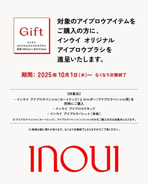 対象のインウイのベースメイク製品を1品以上含む、インウイ製品を合計8,800円(税込)以上ご購入のかたに、インウイ オリジナルファンデーションブラシを進呈いたします。