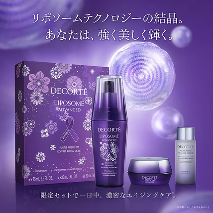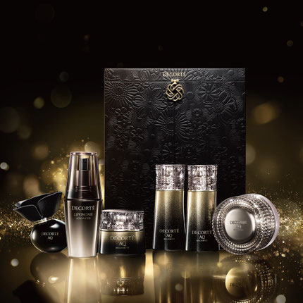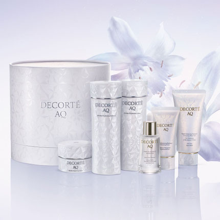 通常の2倍量の多重層リポソームを配合の導入美容液リポソーム セラムはじめコスメデコルテ最高峰のAQミリオリティの乳液・化粧水・クリーム。限定カラーに調合された透明感アップフェイスパウダー、金香木がみずみずしく香る「AQ パルファン」もセット